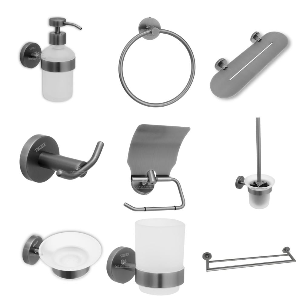 تشكيلة متكاملة من اكسسوارت الحمام الفاخرة من تريديكس باللون التيتانيوم مناسبة لجميع الأغراض والاستخدامات المنزلية والتجارية والفندقية ، تتميز بجودة المواد وأناقة التصمبم وفرادة المظهر واللون .